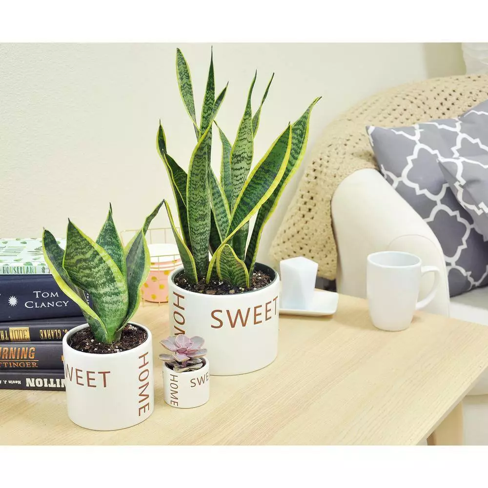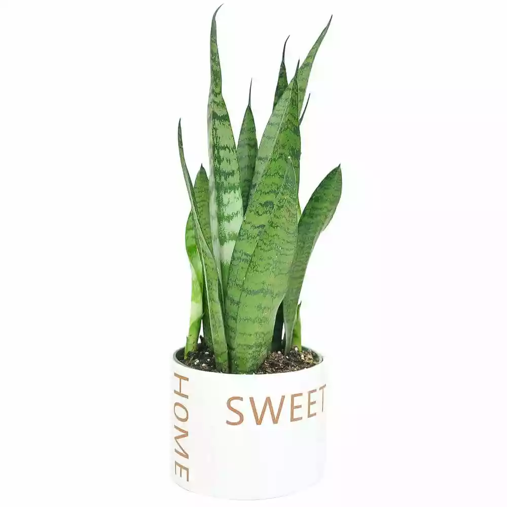 The Snake Plant features stiff, upright, sword-like leaves banded or edged in gray, silver, or gold and adds life to a brightly lit room at home, a lightly shaded porch, or in the office. It grows best near a sunny window. Water when the top couple inches of the soil are dry (about once a week) and be sure all excess water drains away. If the container does not have holes, use approximately 2-3 cups of water, adjust as needed for your environment. Do not let the Snake Plant sit in water or overly soggy soil. This hardy indoor plant is very adaptable to a wide range of growing conditions.