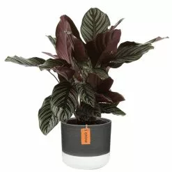 A bold and beautiful houseplant, calathea looks good even without flowers. There are lots of varieties of calathea, but 1 of the most common has luscious, dark green leaves that have scalloped edges and silver brushmarks on the top of the leaves. Underneath, the leaves are a lovely shade of burgundy purple. Each 1 is a living work of art.