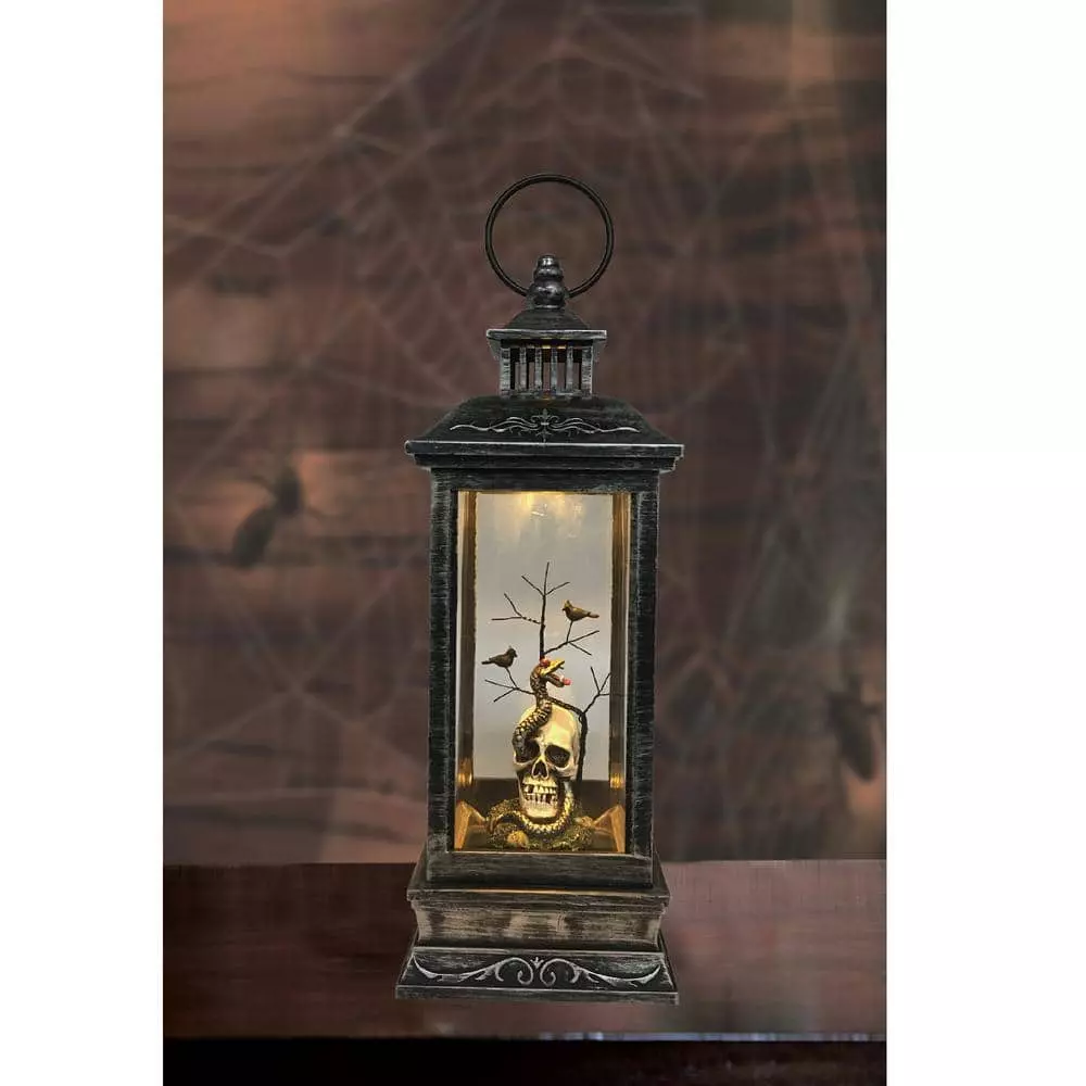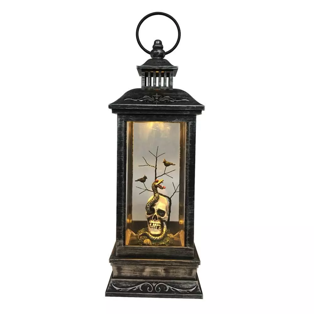 This distressed battery operated lantern is the perfect accent to your Halloween decor. Featuring a spooky skull head with a serpent inside. When switched on the light illuminates the design. Product Features: Weathered black and silver brushed lantern with scroll designs. Features a skull head on greenery and rocks. A snake and birds perched on black twigs accent the skull. Convenient on or off switch is located on the bottom of the base. Round handle for hanging and carrying. Requires 3 AAA batteries – not included. LED warm white light. Recommend for indoor use or covered outdoor use. Dimensions: 11 in. H x 4 in. W x 4 in. D (excludes handle). Material(s): plastic/acrylic.