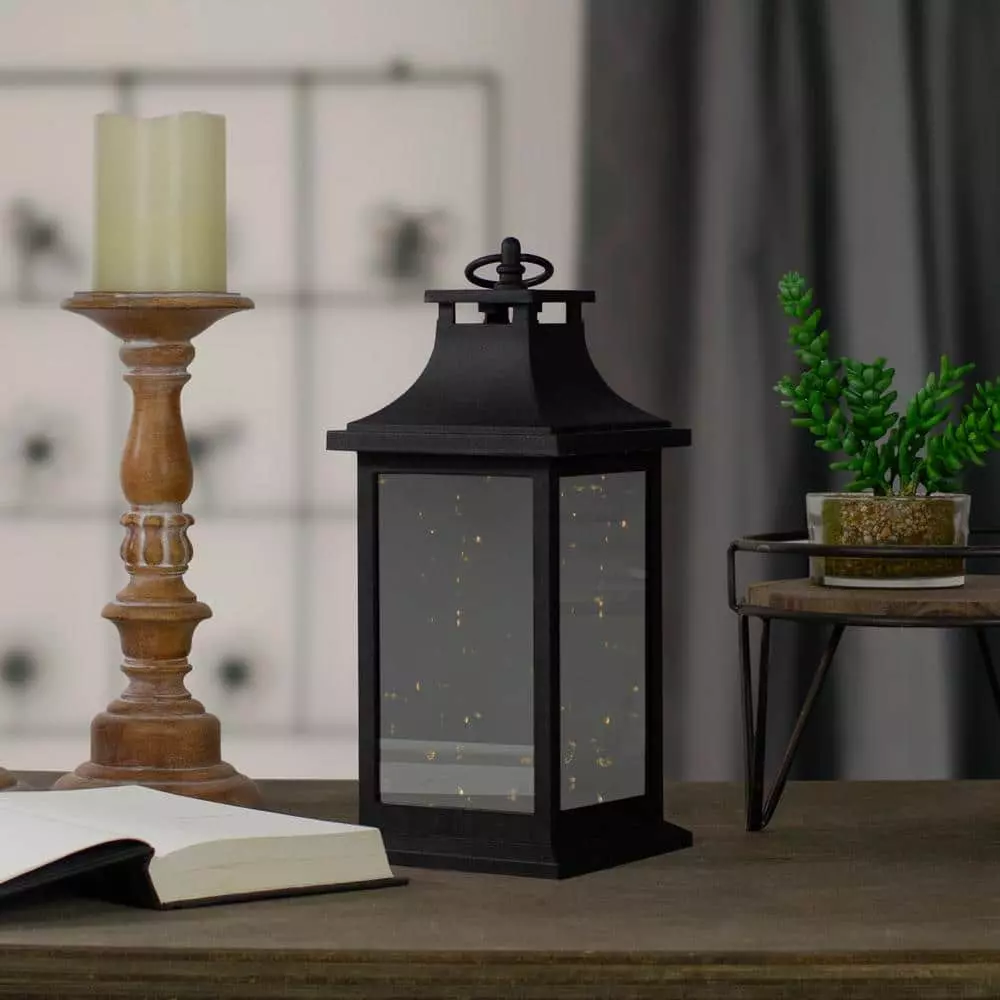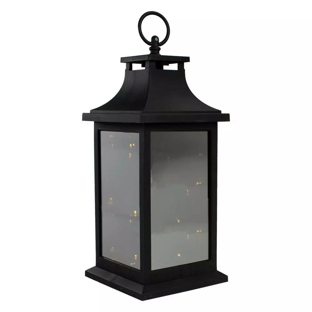 Light up the night with the warm glow of this LED lantern. The classic design proves to fit with a relaxed or modern-day decor. This perfect lantern can be used as a nightlight to light up your patio or even to create a romantic glow for a special evening. Product Features: LED battery operated lantern. 15 energy efficient LED warm white lights. Provides a flickering effect light cast. Mirror effect glass look. Plastic frame with handle. On/off switch located near battery pack. Requires (3) “AAA” batteries- not included. Recommended for indoor use. Dimensions:12 in. H x 5.5 in. W x 5.5 in. D (13.5 in. H to top of handle). Material: plastic.