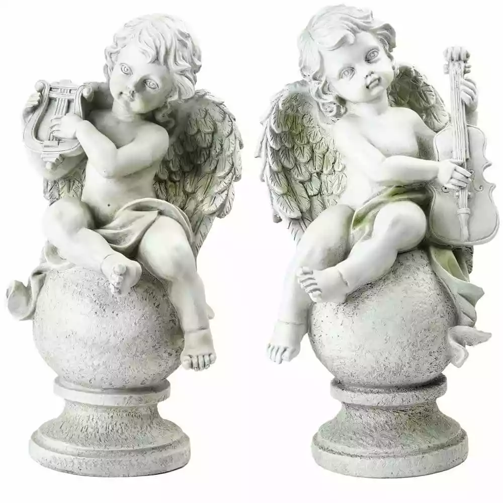 Revamp your patio decor with these exquisite garden statues. These sitting cherub angel statues are the perfect decorative addition in any home complementing any decor style. Versatility and durability of the statue make it more life-like and impressive. Product Features: These charming cherub angels are sitting on the top of round textured finials. One is playing the harp while the other is playing the violin. Feature hints of color for a unique look. Perfect addition to any garden or outdoor decor. For indoor or outdoor use. Dimensions: Harp cherub: 14.75 in. H x 7.25 in. W x 6.5 in. D. Violin cherub: 14.75 in. H x 7.75 in. W x 6.5 in. D Material(s): polyresin.