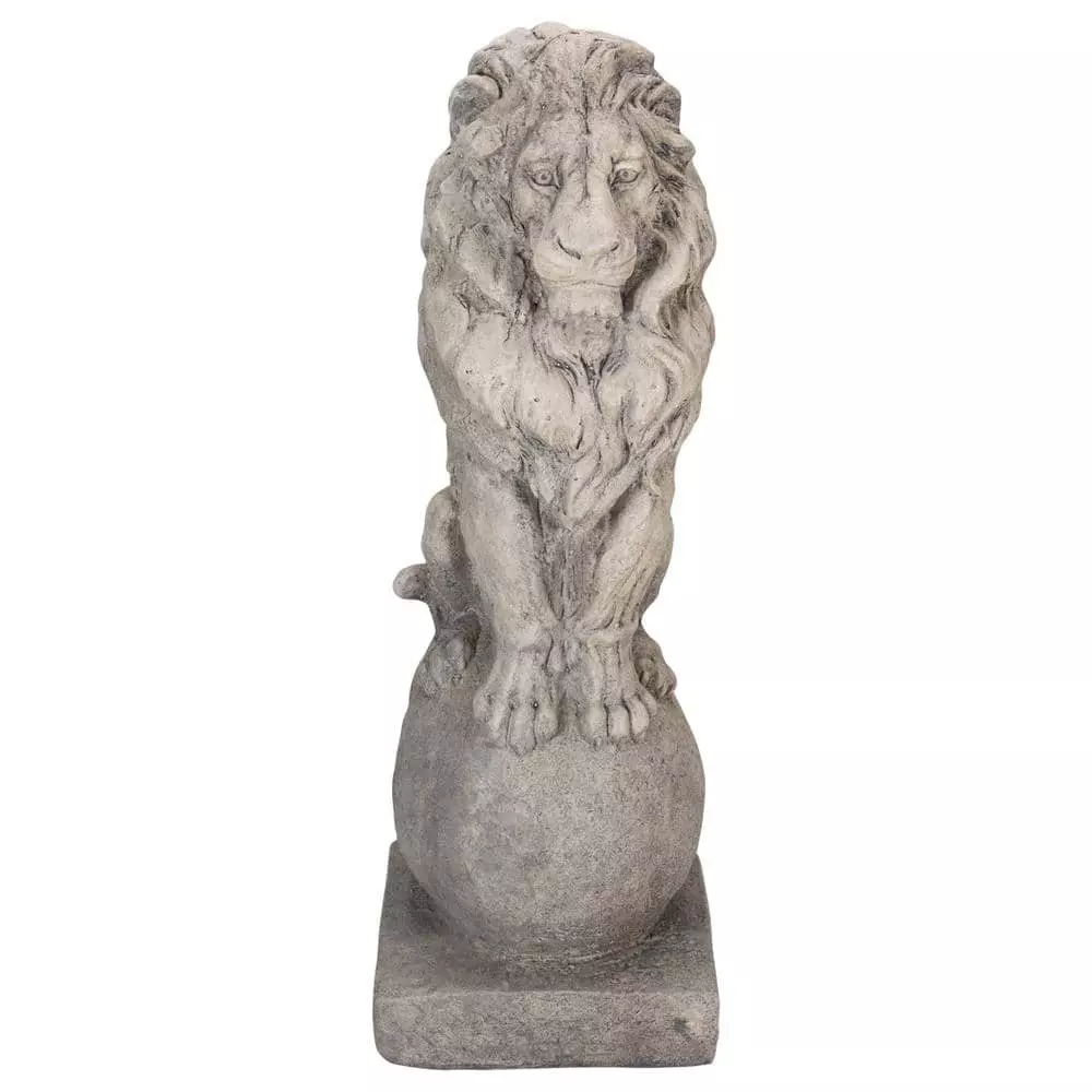 This incredible lion statue makes a bold statement in any outdoor area. Intricately casted with the finest details the regal creature is a must have. The ornate pedestal adds a maximum effect. Sitting lion outdoor garden statue. Intricate details from skilled casting. Lion is hallow. For indoor or outdoor use. Dimensions: 17.75 in. H x 6 in. W x 7.25 in. D. Material(s) magnesium oxide concrete (MgO).