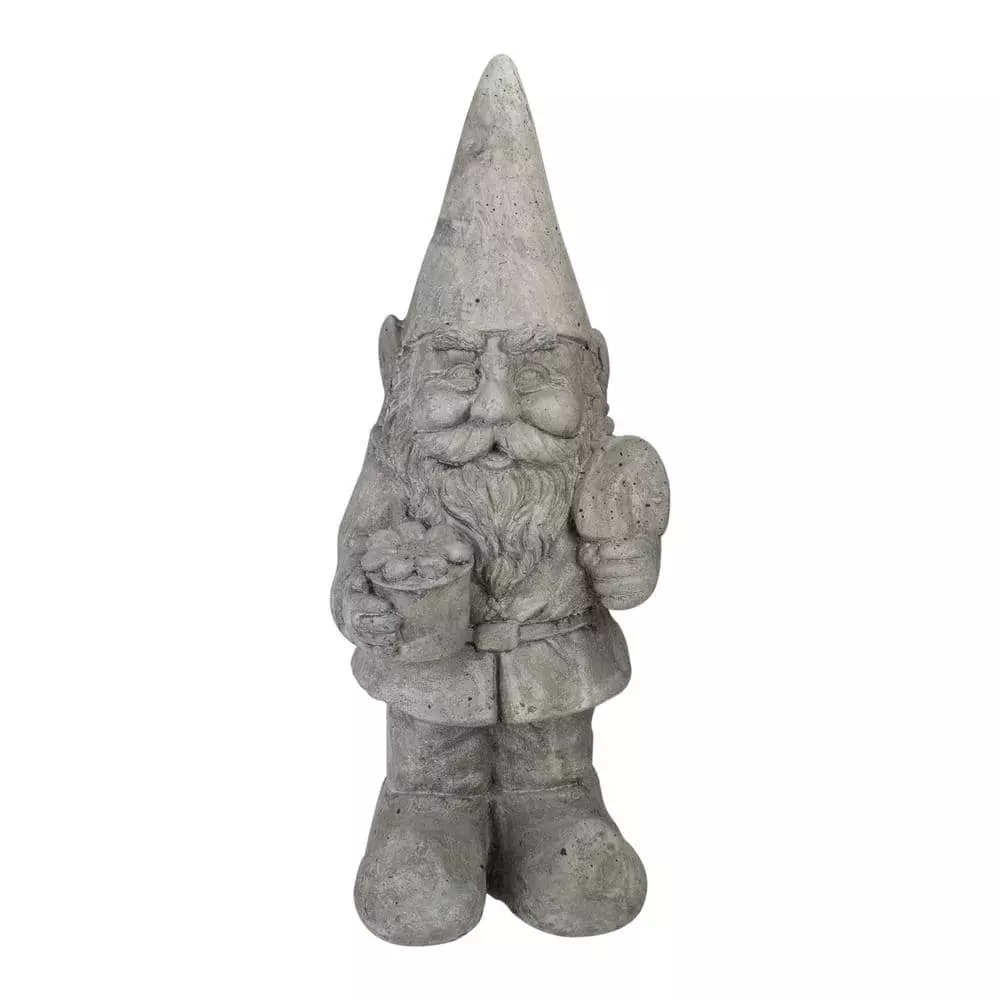 Gnomes are best known for guarding Earthly treasures providing good luck and are perfect for protecting your garden This adorable gray gardener will add a bit of whimsical fun and will most definitely watch over your garden. Add this guy to your gnome collection or give him as a gift Features: Gnome outdoor garden statue. Carrying a shovel in his left hand. He carries a flower in a pot in his right hand. Has a full beard and mustache. He wears a traditional pointed gnome hat and boots. Dimensions: 18.5 in. W x 7 in. W x 7 in. D. Material(s):polyresin.