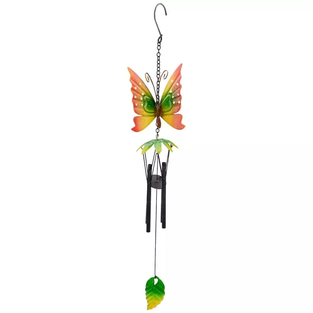 There’s nothing like the sound of windchimes dancing in the wind. This beautiful butterfly chime adds color and music to any outdoor space. Hang anywhere to enjoy the epitome of summer sounds. Metal butterfly outdoor windchime. 4 hanging tube chimes. Easy to hang from metal chain with hook. Dimensions: 19 in. H x 4 in. W x 2.5 in. D. Material(s): metal.