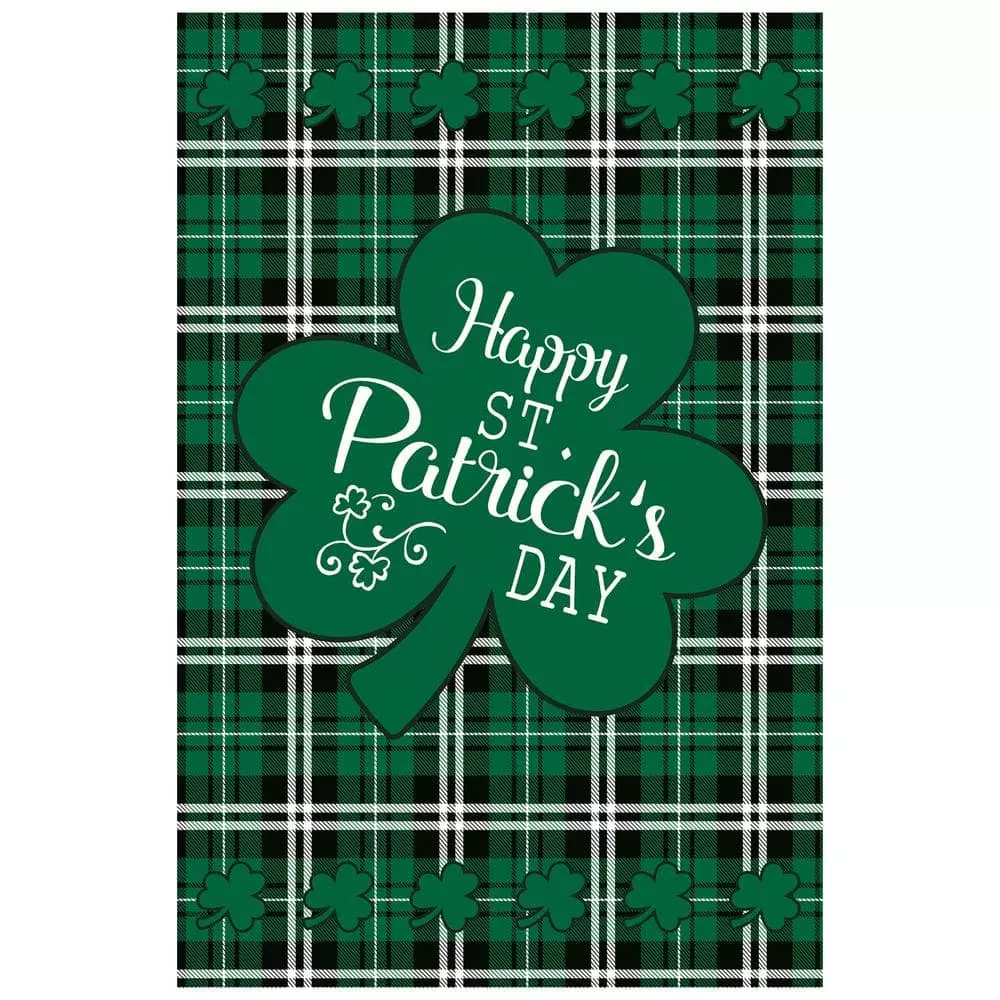 Represent your Irish heritage with this plaid shamrock house flag. Bring a pinch of luck and a pop of color to your home by displaying this flag in your yard. Just perfect for St. Patrick’s Day. Features: Green, white and black plaid designed house flag. Reads “Happy St. Patrick’s Day”. Features a large shamrock and a border of mini shamrocks. A soft, high-quality fabric for durability. Sleeve on top allows the flag to slide onto the flagpole. Double-sided design. Care instructions: Handwash in cold water with mild soap. Hang dry. Use cool iron if needed. Dimensions: 40 in. L x 28 in. W. Material(s): polyester. Note: Flagpole is not included.