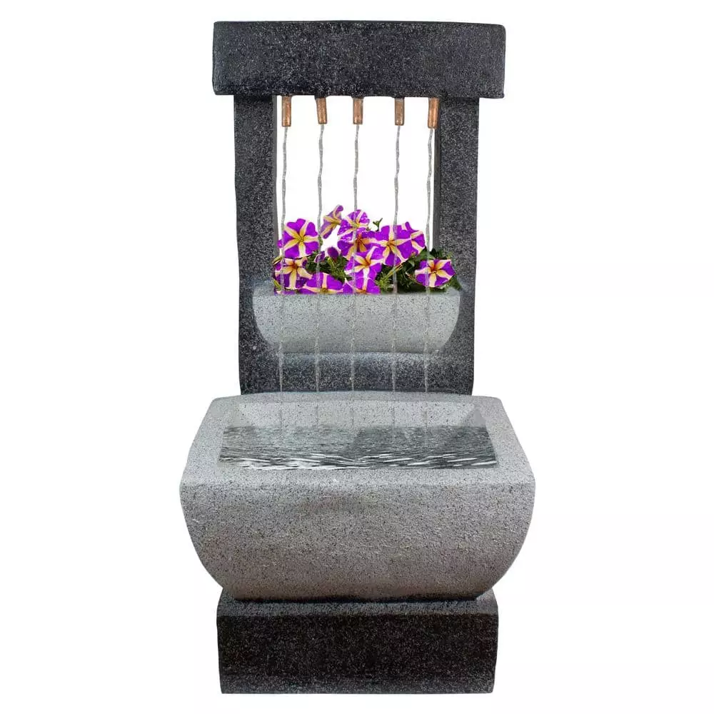 This modern-style water fountain provides a tranquil and soothing addition to your indoor or outdoor living areas. Relax to the sounds of the soft natural water flow as it trickles down through the fountain. Truly a unique water feature this-piece is richly detailed and sure to be the topic of conversation. Product features: Self-sustaining rainfall style fountain. Textured feel with a unique built-in planter. Constantly recycles the same water. Constructed from durable polystone with a modern design. Fountain is illuminated by a white LED light. Some assembly required. 12-Volt 60 Hertz 0.07 Amp submersible pump. UL certified and approved for indoor or outdoor use. Dimensions: 26 in. H x 13.25 in. L x 14.5 in. W. Material(s): polystone.