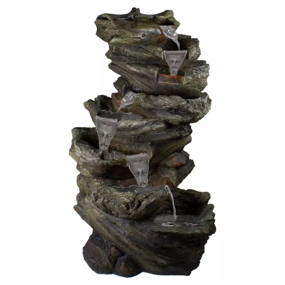 This water fountain would be the perfect addition to your garden. The mesmerizing sound of water falling from rock to rock will put you into a peaceful state every time. Perfect to match any already existing garden decor. Features: This is a self-sustaining fountain. This fountain is illuminated from within by LED lights. Water flows from rock to rock. Constantly recycles the same water. Some assembly required. Additional Product Features: Durable and weather resistant. AC adapter input: 120-Volt 60 Hz. AC adapter output: 12-Volt 200 milli-ampere. Class 2 power supply. Rainproof. UL listed for indoor or outdoor use. Dimensions: 42 in. H x 21 in. W x 16 in. D. Material(s): resin.