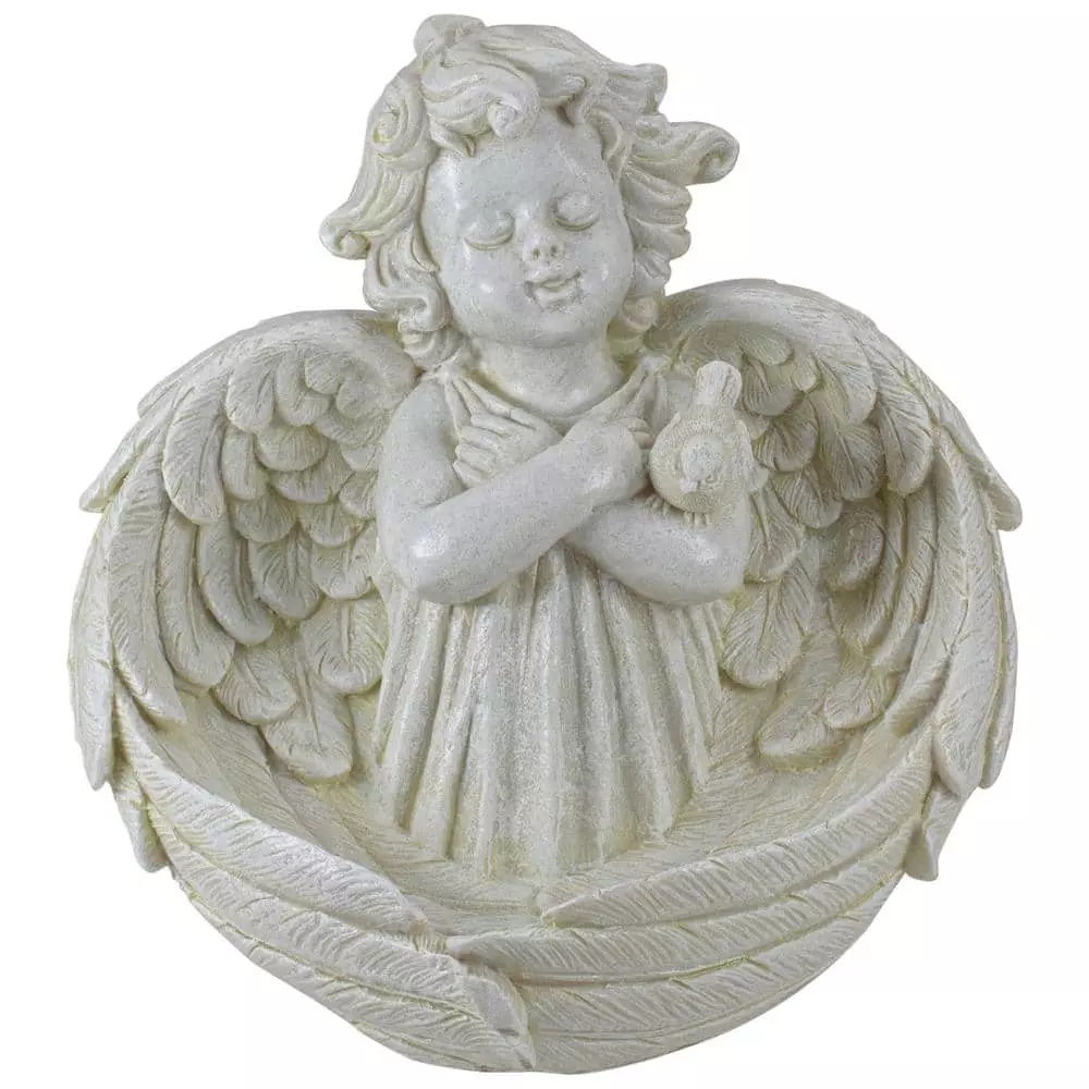 Welcome spring and summer to your patio or home decor with this angelic garden statue. Adding a cherub angel to your outdoor space will bring peace and serenity to your garden. Your home will be the favorite for the neighborhood birds when they visit this bird feeder. Features: Features a cherub angel with folded wings. Angel has a bird perched on her arm. Folded wings create the bird feeder bowl. Designed with a distressed ivory finish. Meticulously sculpted by highly skilled artisans with fine attention to detail. Dimensions: 9 in. H x 9 in. W x 6 in. D. Material(s): polyresin.