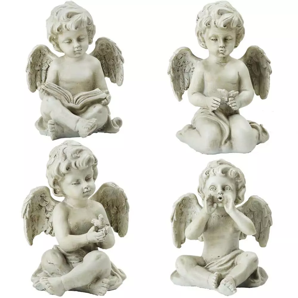 Whether used in the garden, on the patio or inside by a mantle place, these cherub angel statues are sure to add character to any area. Featuring four cherub angels in different poses. You can use these little angels anywhere for a heavenly reminder. Truly makes a thoughtful gift for a friend or family member any time of the year. Product Features: Set of 4 cherub angel outdoor garden statues. Angels each have a different pose. One is sitting with his legs crossed holding a bird in his hands. One is sitting with his legs crossed reading a book. One is kneeling with a butterfly on his hand. One is sitting with his hands next to his mouth ready to shout something. Perfect for memorials, patios or on mantle places. Meticulously sculpted by highly skilled artisans with fine attention to detail. For indoor or outdoor use. Dimensions: Angel with bird: 6.25 in. H x 5 in. W x 3.5 in. D. Angel with book: 6 in. H x 5 in. W x 4.5 in. D. Angel with butterfly: 6.5 in. H x 5 in. W x 3.75 in. D. Angel shouting: 6 in. H x 5 in. W x 4.75 in. D. Material(s): polyresin.