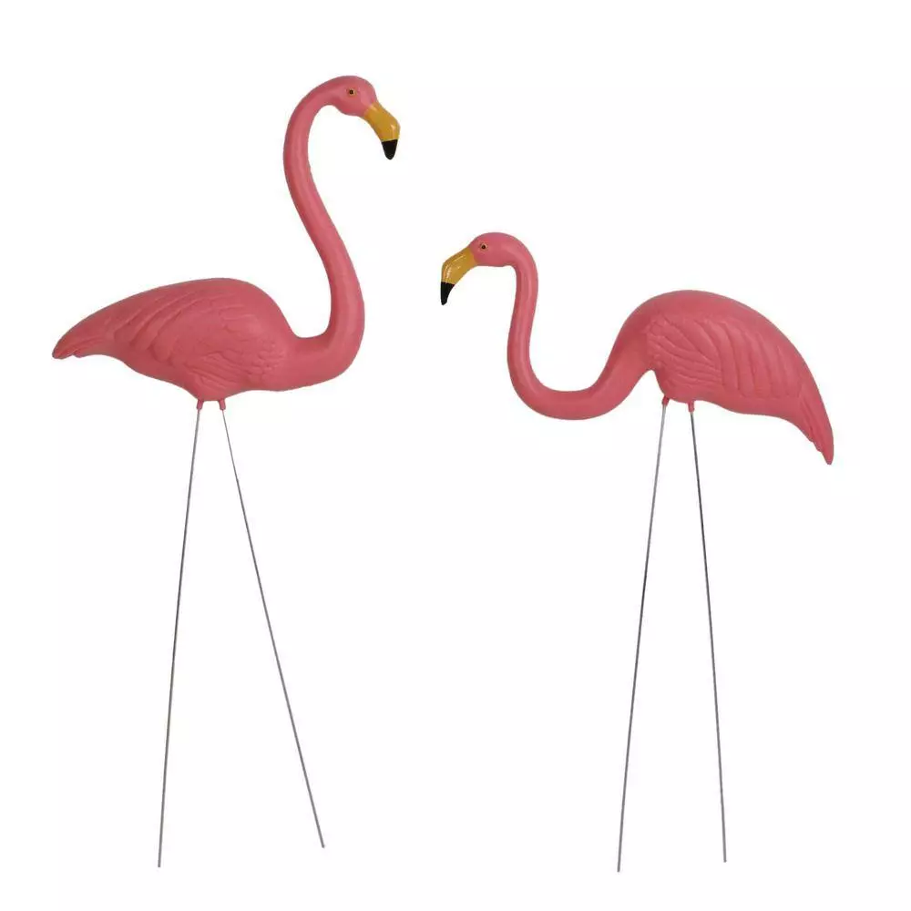 Dating back to the 1950’s many believe that the popular flamingo lawn decoration is native to Florida however the tradition began in Leominster Massachusetts. Sun sandy beaches and sea come to mind when we think of these tropical birds. They have become a staple on many front lawns over the years. This darling set of 2 features realistic feather patterns on both sides of the body with yellow and gold beaks and black eyes. They come with iron rods that easily screw into the flamingos allowing them to be securely staked into the ground. These durable PE weather resistant garden decorations will last for many years to come. Perfect for adding a pop of color to your garden patio or pond area. Features: Set of 2 purple flamingos. Feather design on the body. Easy to install. 4 iron rod stakes are included. Weather resistant. Dimensions: Flamingo (left): 26 in. H x 17.75 in. W x 3.75 in. D. Flamingo (right): 33 in. H x 14.75 in. W x 3.75 in. D. Rods: 20 in. L. Material(s): PE/iron.